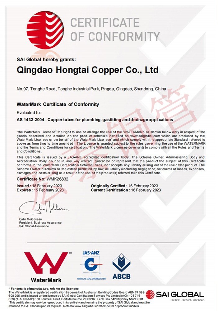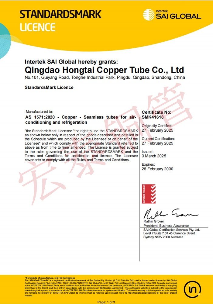 AG注册官网铜管产品顺遂通过AS 1571无缝制冷用铜管标准认证【证书编号:SMK41618】和AS 1432给排水铜管标准认证【证书编号:WMK26832】。